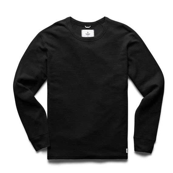 A long sleeve thermal made from fine merino waffle designed to provide a warm base in cooler temperatures. Designed with a casual fit, drop shoulders, rib-bound collar, merino rib cuffs, and semi-raglan sleeves.