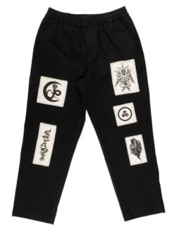 - 7 different printed canvas graphic patches sewn down on legs